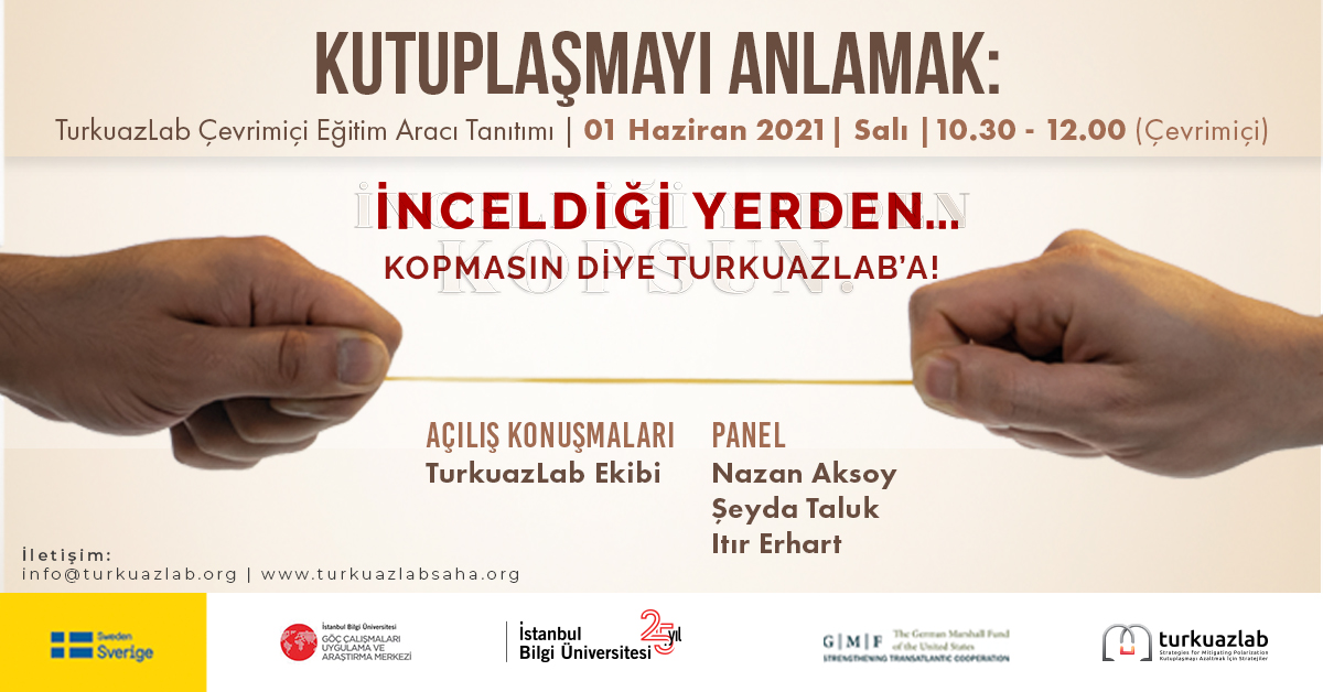Kutuplaşmayı Anlamak: TurkuazLab Çevrimiçi Eğitim Aracı Tanıtımı etkinliği 01 Haziran 2021, 10:30-12:00 saatleri arasında gerçekleştirilecektir. Etkinlik detaylarına aşağıda ulaşabilirsiniz: